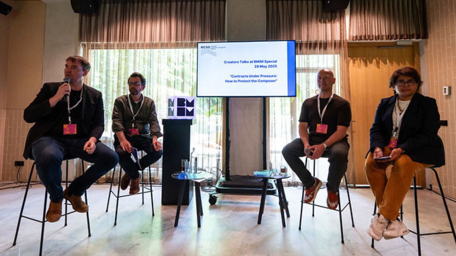 On 28 May 2025, at Buma Music in Motion’s BMIM Special in Amsterdam, the Netherlands, the panel, “Contracts Under Pressure: How to Protect the Composer” featured composers Nainita Desai and Hans Everling (BCMM), and ECSA Secretary General Marc du Moulin, and was moderated by composer and ECSA Vice-President Jesper Hansen. The four shared a range of insights on how we can better protect audiovisual composers from unfair contracts. Our report on audiovisual composers’ contracts shows that buyouts, pseudo-publishing and lack of transparency too often deprive composers of their rights and remuneration. The panelists highlighted what can be done at international and national level to bring a halt to such practices, and emphasised the importance for composers to be aware of their rights.