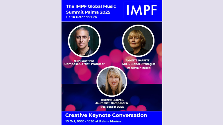 Between 6-10 October, the Independent Music Publishers International Forum (IMPF) organised its yearly Global Music Summit in Palma de Mallorca, Spain, gathering IMPF’s music publisher members, music creators, and other music industry professionals for various talks, panels, and networking activities. On 10 October, ECSA President Helienne Lindvall participated in a keynote conversation in the frame of the conference, alongside composer and artist Nitin Sawhney and Annette Barrett (MD & Global Strategist, Reservoir Media). The conversation focused on the relationship between publishers and composers and what publishers can do for composers, as well as on AI, the value of human creativity, and how we can protect it.