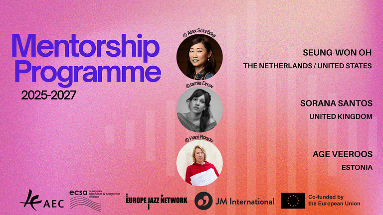We are pleased to announce the selected mentors for the AEC–ECSA–EJN–JMI Mentorship Programme 2025–2027, an EU co-funded initiative dedicated to supporting emerging artists while actively promoting gender equality and non-binary visibility in the music industry. We are delighted to welcome the following mentors, nominated through ECSA member organisations and representing the contemporary classical music field: Seung-Won Oh (Nieuw Geneco - the Netherlands), Sorana Santos (PCAM - United Kingdom), and Age Veeroos (Estonian Composers' Union - Estonia). We look forward to sharing our mentors' expertise with the mentees!
